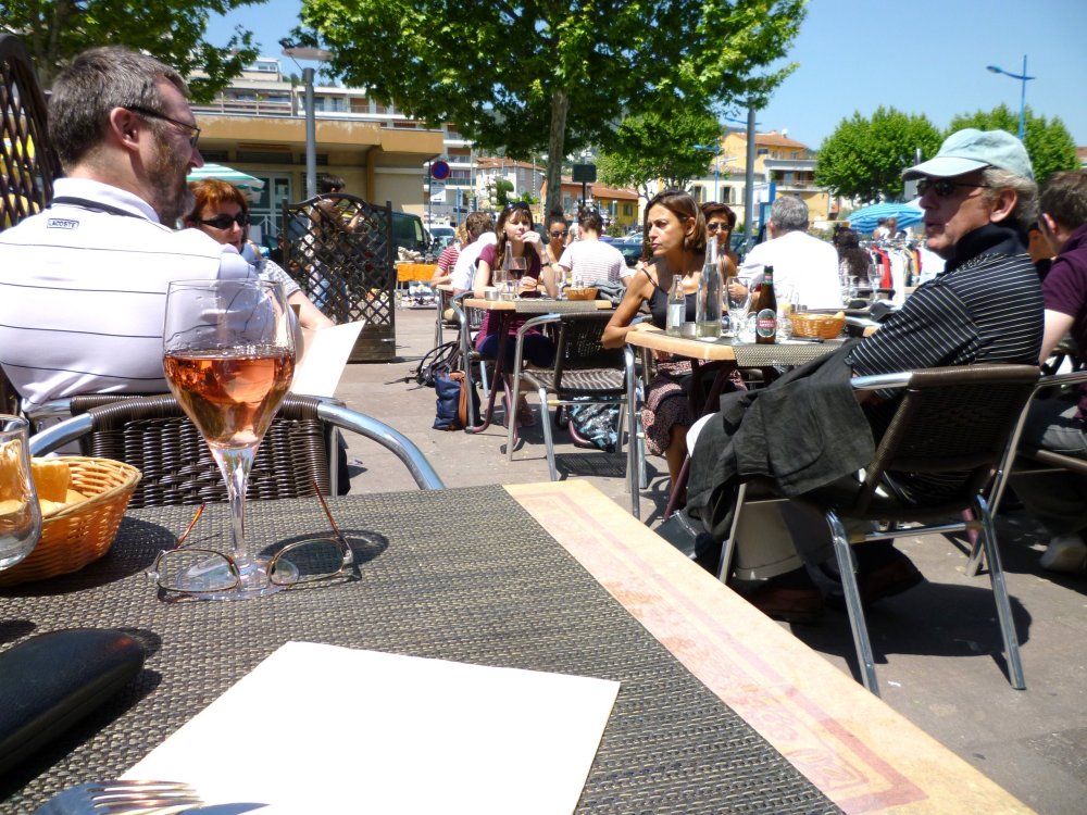 La terrasse du SAINT CHARLES. Le CEC sur la droite hors cadrage. Oksana Shkiray médite avec ses lunettes dans les cheveux.